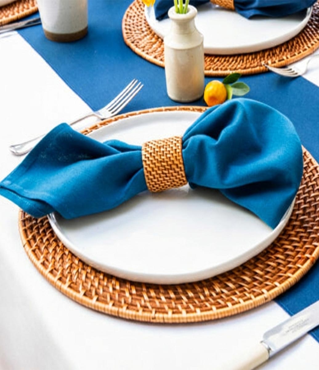 O guardanapo azul royal é um ponto focal de cor que pode ser o elemento chave na sua decoração. Para um visual clássico e contrastante, combine-o com toalhas de mesa brancas, beges ou cinzas claras. Utilize anéis de guardanapo em prata, dourado ou ráfia para adicionar textura e um toque artesanal.