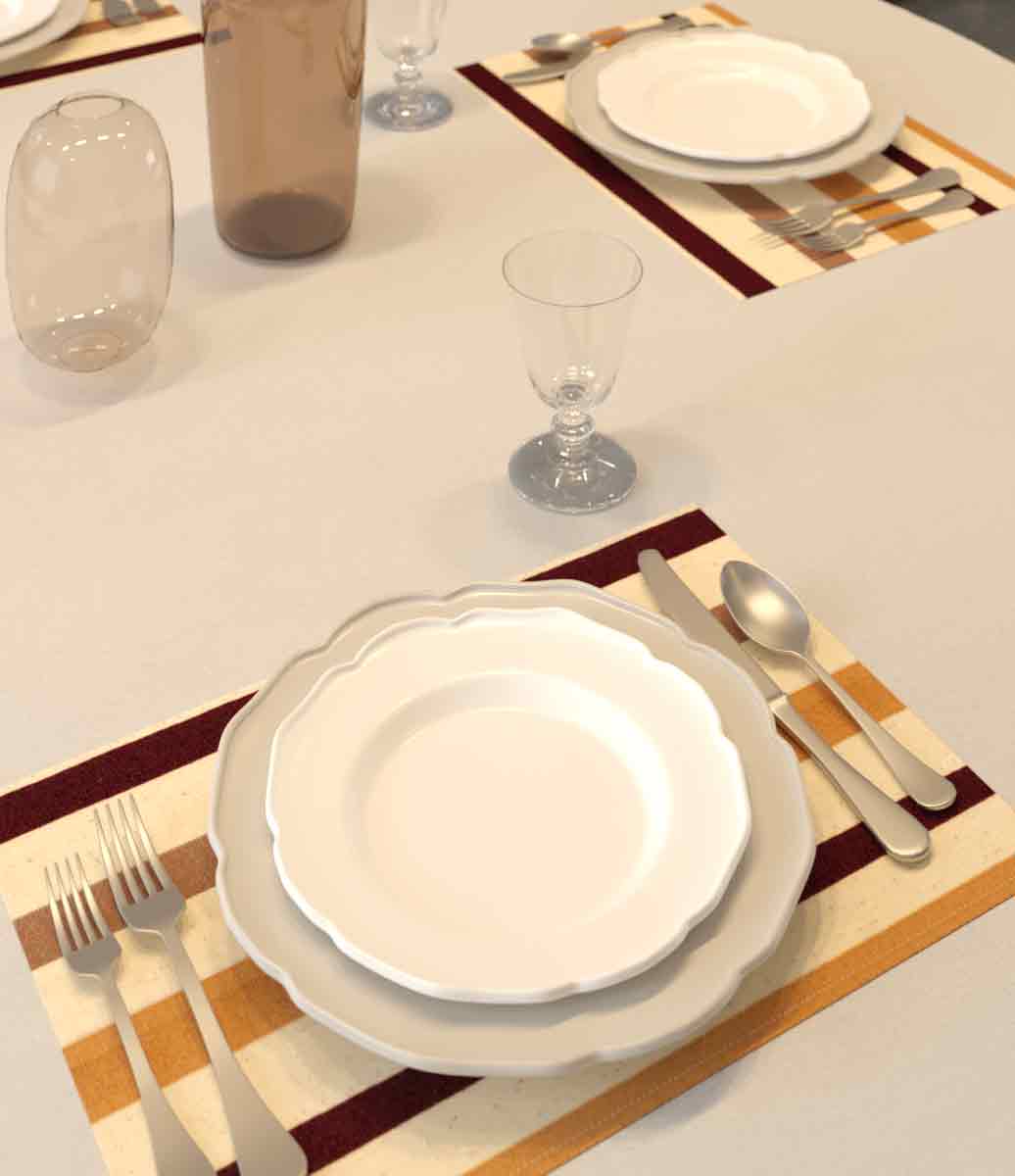 As listras em tons de vinho, mostarda, bege e marrom trazem aconchego e requinte, sendo perfeitas para compor uma mesa posta elegante, seja em ocasiões especiais ou no dia a dia.