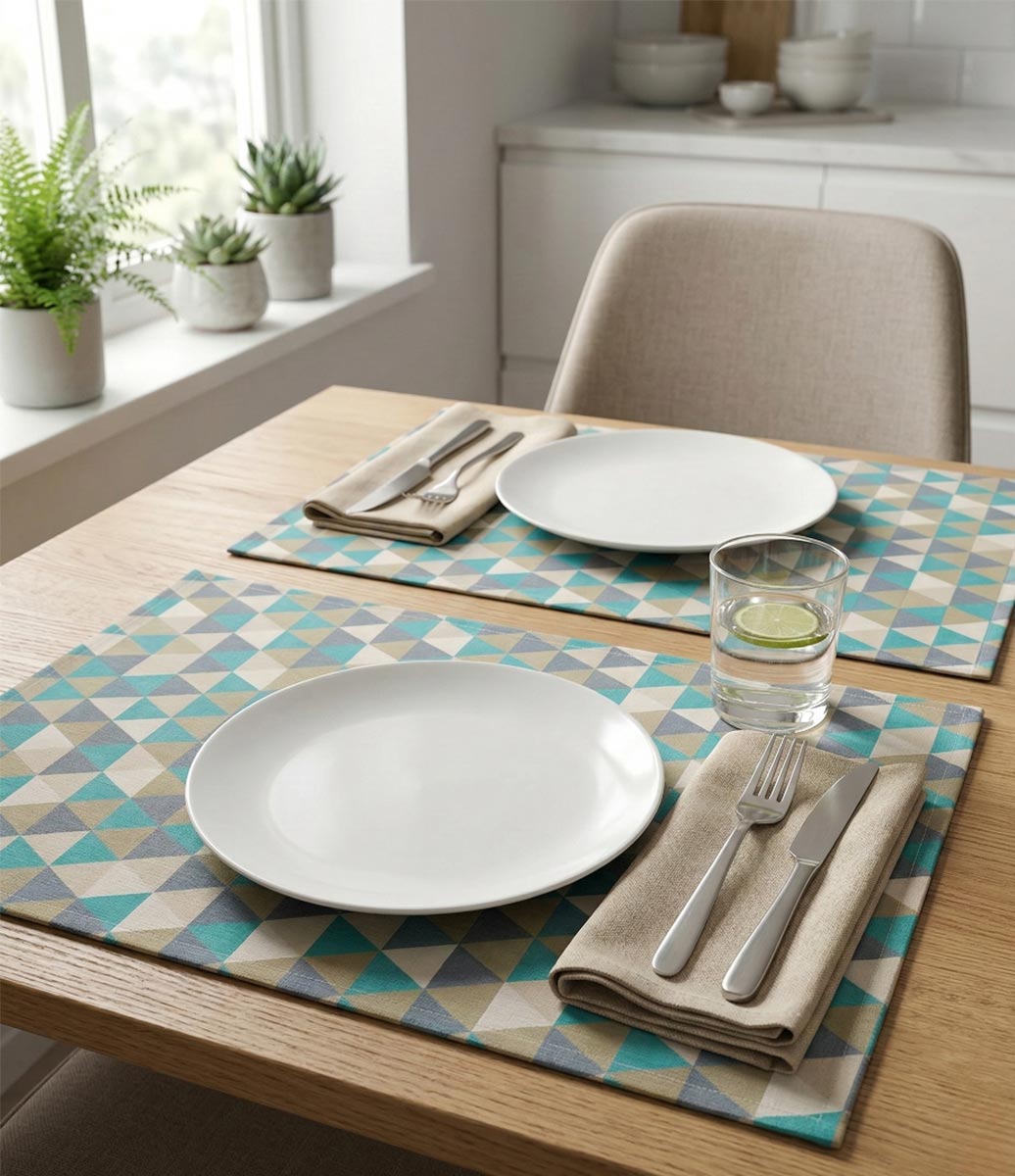 Um modelo com lindo design feito em tecido com fácil limpeza que não deixa penetrar líquidos e sujeiras. Assim é o Jogo Americano Impermeável 4 Peças Triângulos. Fabricado em tecido gorgurão waterblock.
