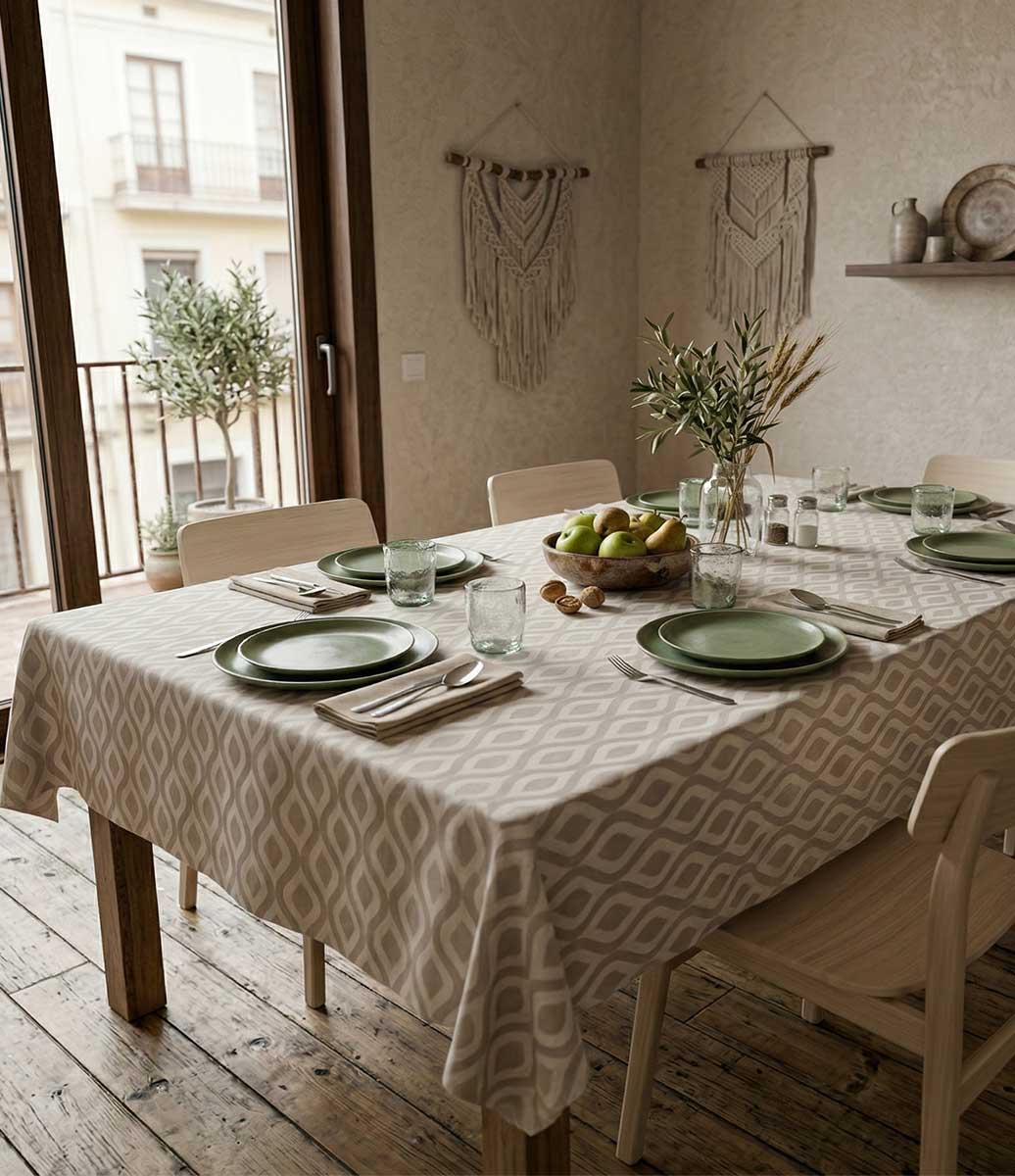 O linho é, indiscutivelmente, o tecido mais nobre e desejado da alta decoração. Ele confere um caimento pesado, estruturado e visualmente riquíssimo à mesa. Nesta peça, a beleza natural e a textura orgânica do linho servem de tela para a estampa "Sinuosa": padrões geométricos contínuos que se entrelaçam de forma harmônica e moderna. O resultado é uma toalha de mesa extremamente elegante, que foge do óbvio e atrai todos os olhares, valorizando desde as louças mais minimalistas até as composições mais elaboradas.